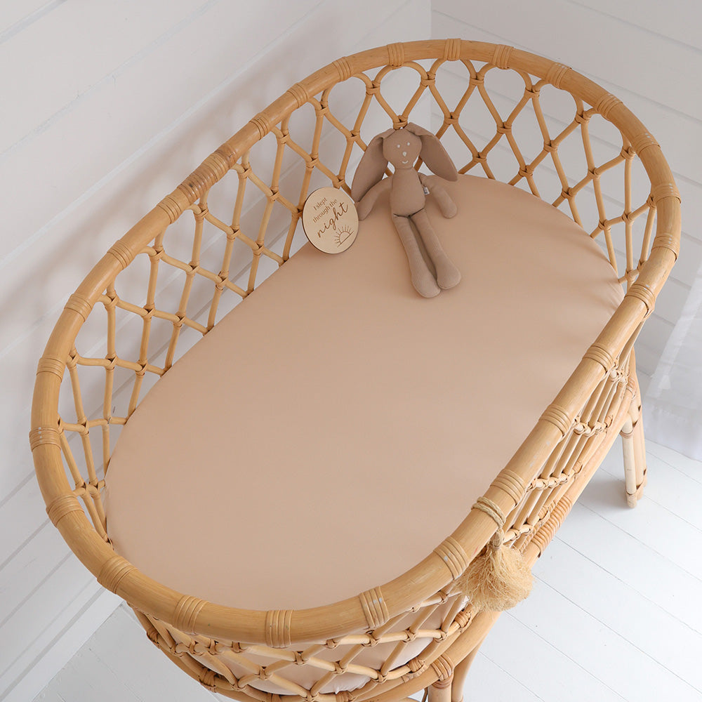 Snuggle Hunny Babyccino Fitted Bassinet Sheet doubles as a Change Pad Cover and is made from snuggly soft organic stretch cotton jersey. It is stretchy so fits most bassinet mattress sizes and comes in a matching drawstring bag.