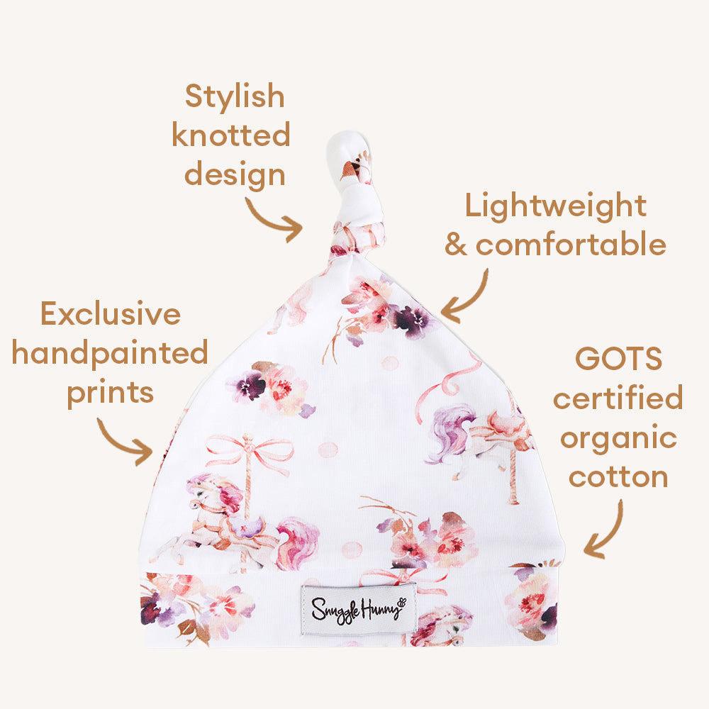 Our Snuggle Hunny Carousel knotted baby beanie is soft and snuggly and made with Certified Organic cotton so you know bub has only the best. For newborns to 6 months old.