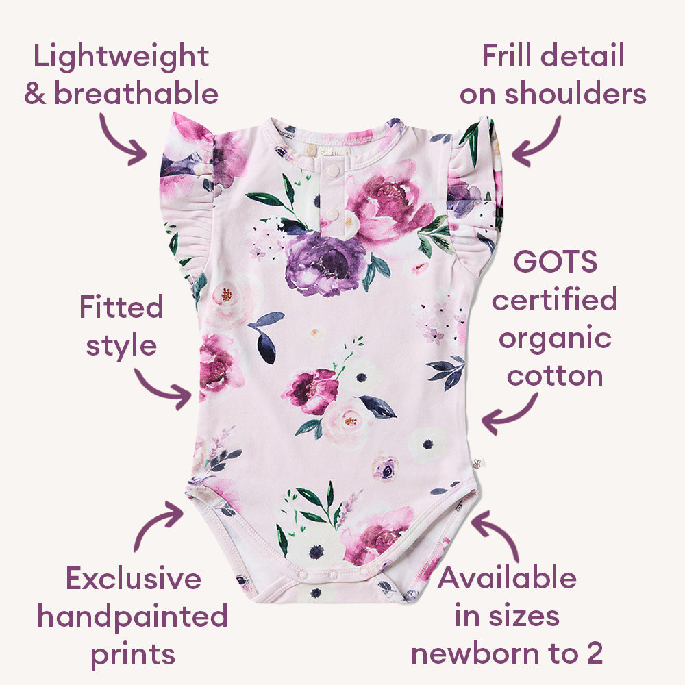 Soft and stretchy, our bodysuits are easy-care and coordinate well with our bloomers, pants and shorts. The bloomers have sweet frills to match the sleeves on this style.