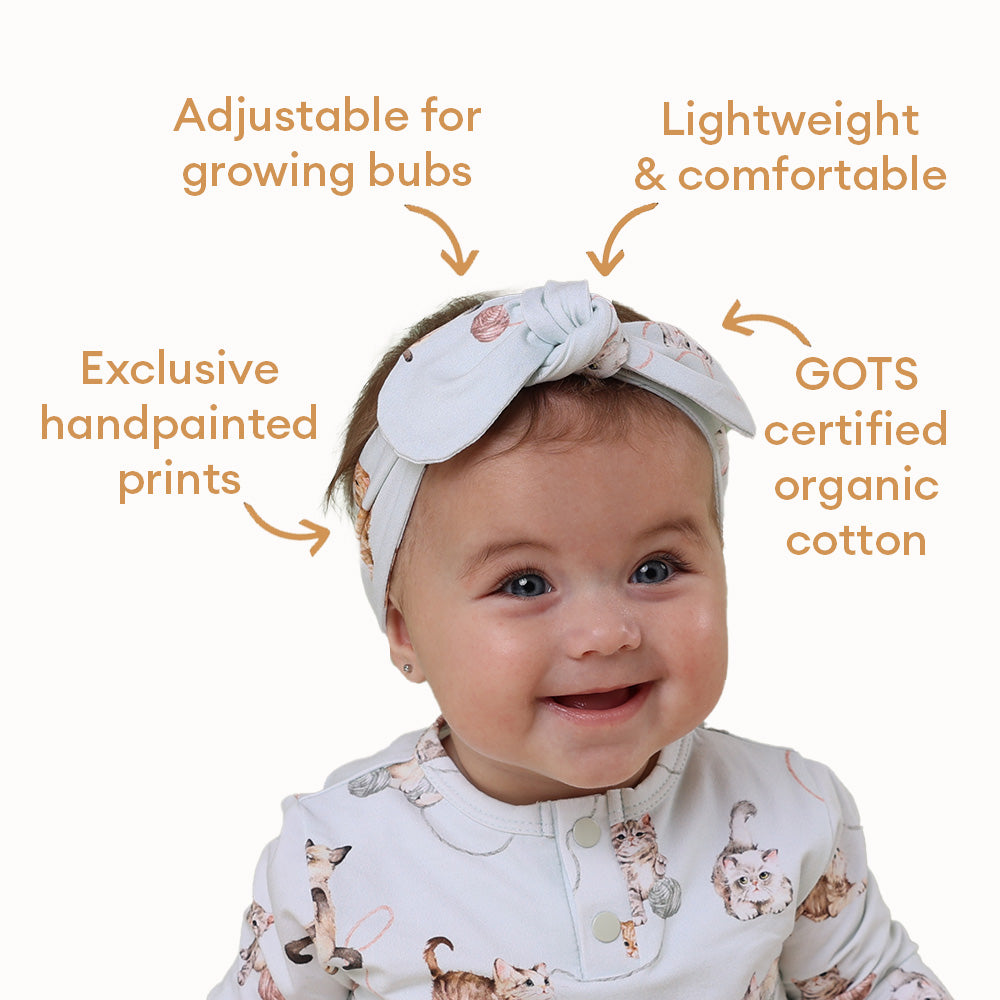 Our Snuggle Hunny organic cotton jersey topknot is soft and snuggly. This topknot features our Kittens design and is made with Certified Organic cotton.
