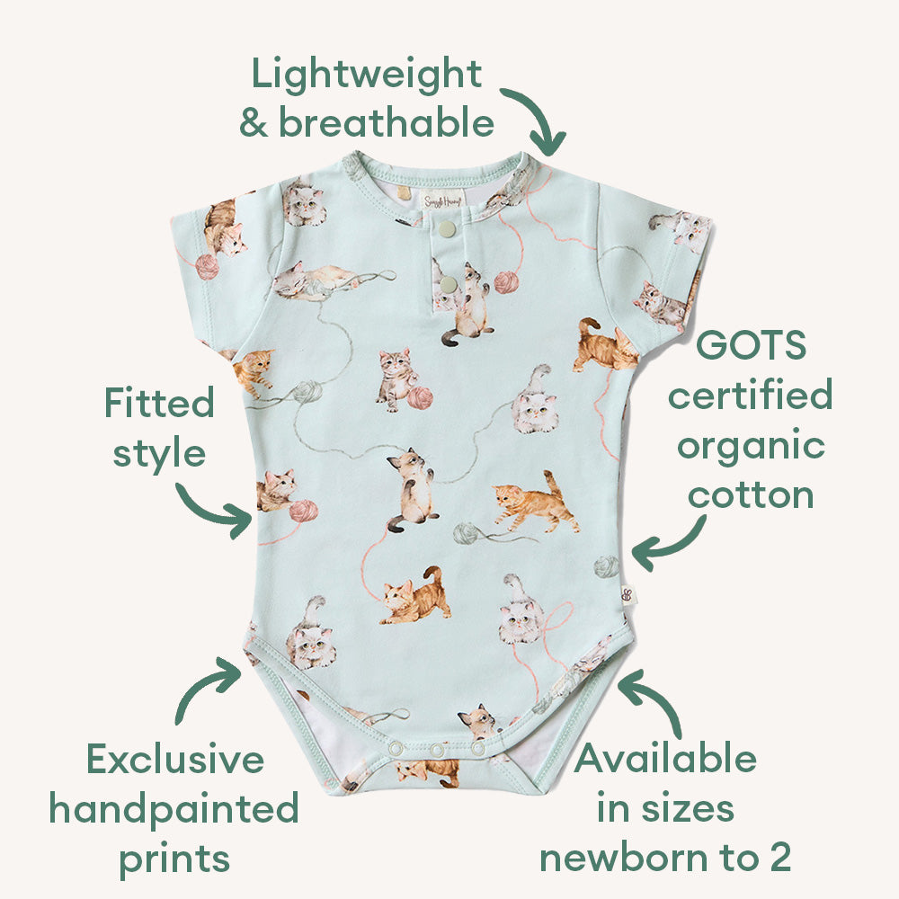 Snuggle Hunny organic bodysuits are made for babies and toddlers and features our exclusive Kittens print. This bodysuit is short-sleeved, perfect for warmer weather, and under layers.