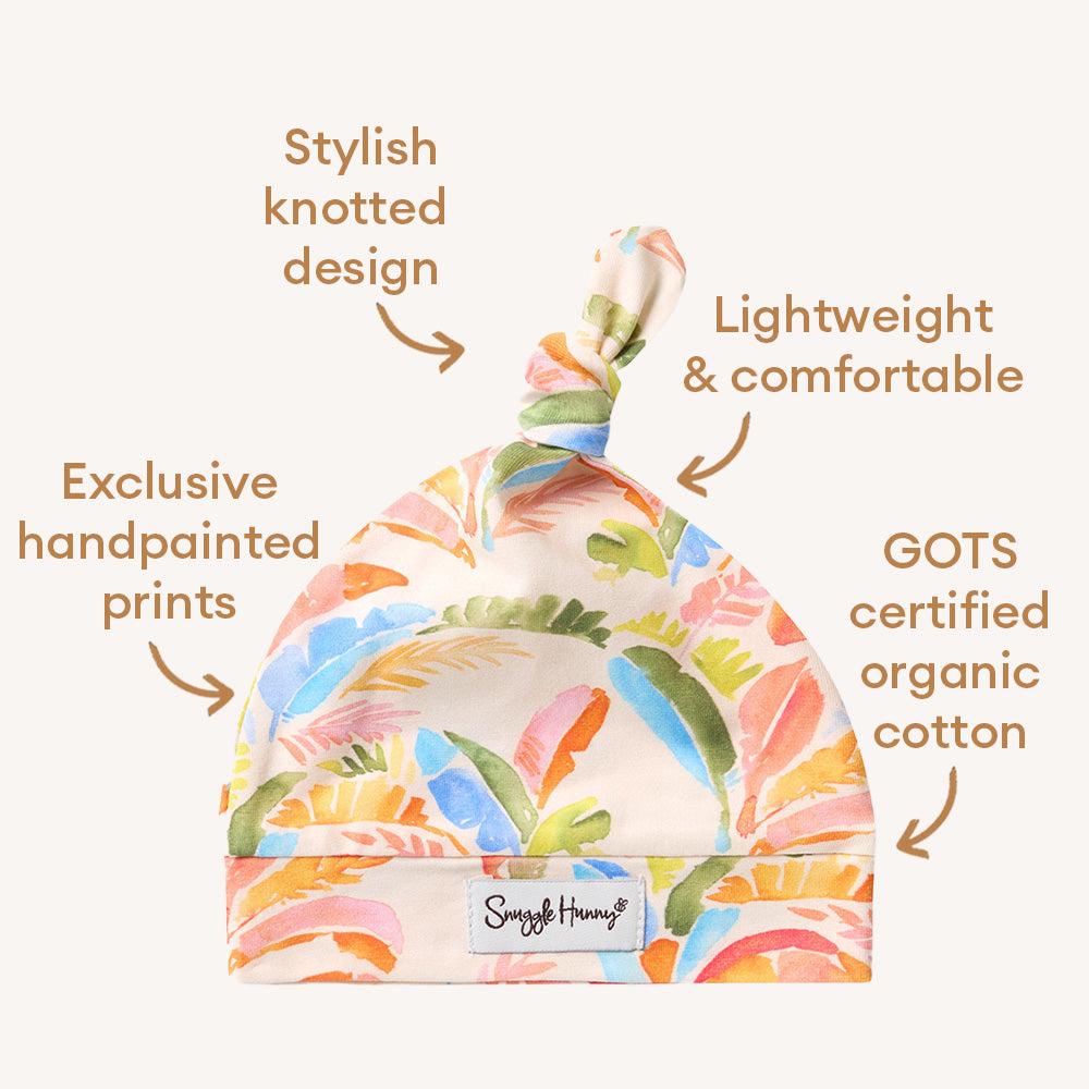 Our Snuggle Hunny Summer Palm knotted baby beanie is soft and snuggly and made with Certified Organic cotton so you know bub has only the best. For newborns to 6 months old.